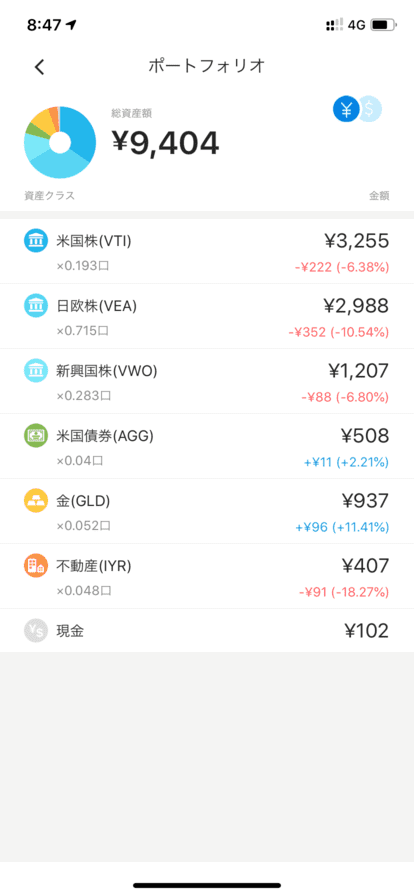 ただ今までウェルスナビがリードしていた分、金額としてはウェルスナビの方が含み損が少なくなっています。